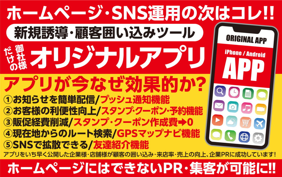 インターネット利用者のほとんどがスマホを利用し、アプリを利用している現在、集客方法は、新規誘導・顧客囲い込みツールのオリジナルアプリが有利です。プッシュ通知機能・スタンプ・クーポン・予約機能・GPSマップナビ機能・友達紹介機能を駆使して、ホームページにはできないPR・集客が可能になります。オリジナルアプリは、朝日ビジネスにご相談ください。